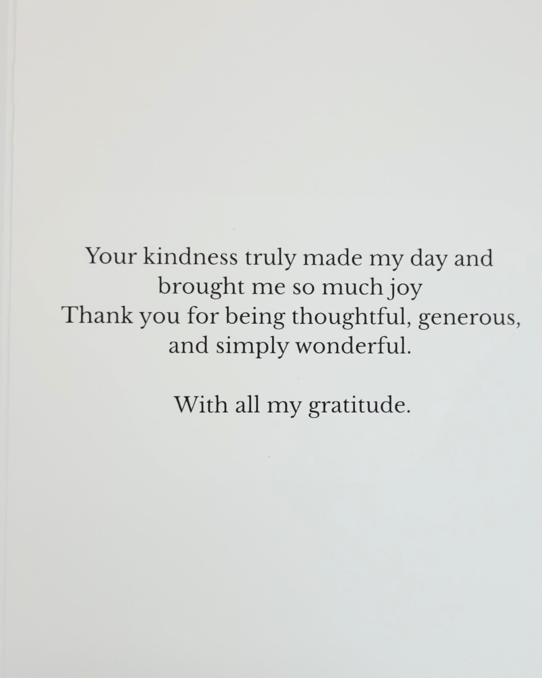 Inside sentiment: Your kindness truly made my day and brought me so much joy. Thank you for being thoughtful, generous, and simply wonderful. With all my gratitude.