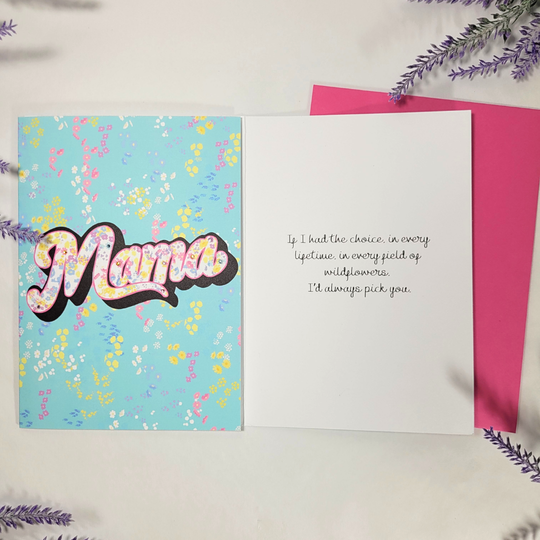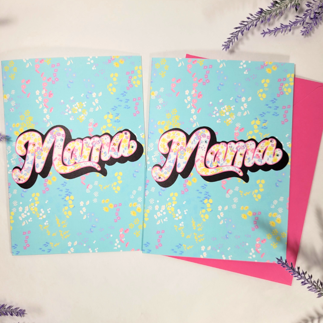 Celebrate Mom all year around with this playful card featuring the word Mama filled with and on a background of wildflowers. Sparkling rhinestones add a fun, eye-catching touch to the lettering.