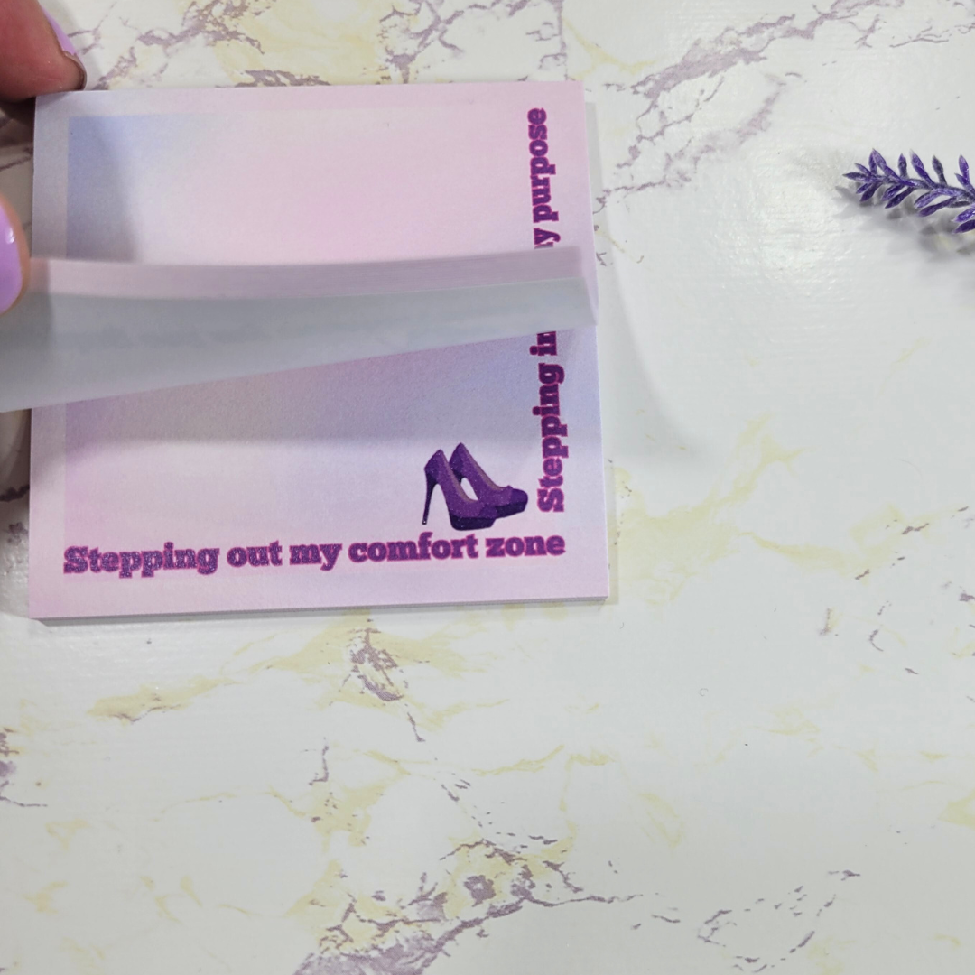 These sticky notes feature the phrases "Stepping out my comfort zone" and "Stepping into my purpose," along with a playful pair of purple high heels to inspire your next bold move.